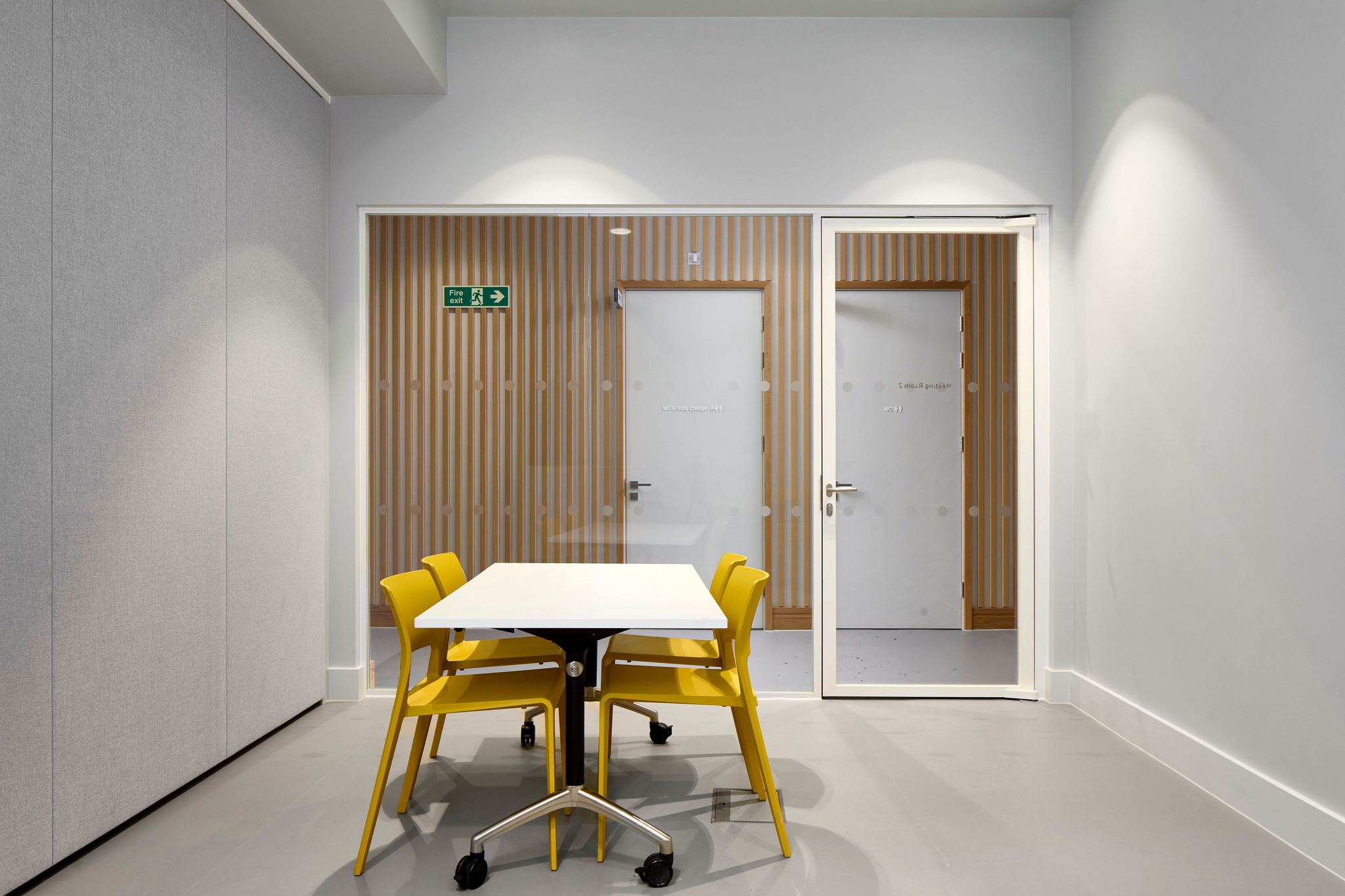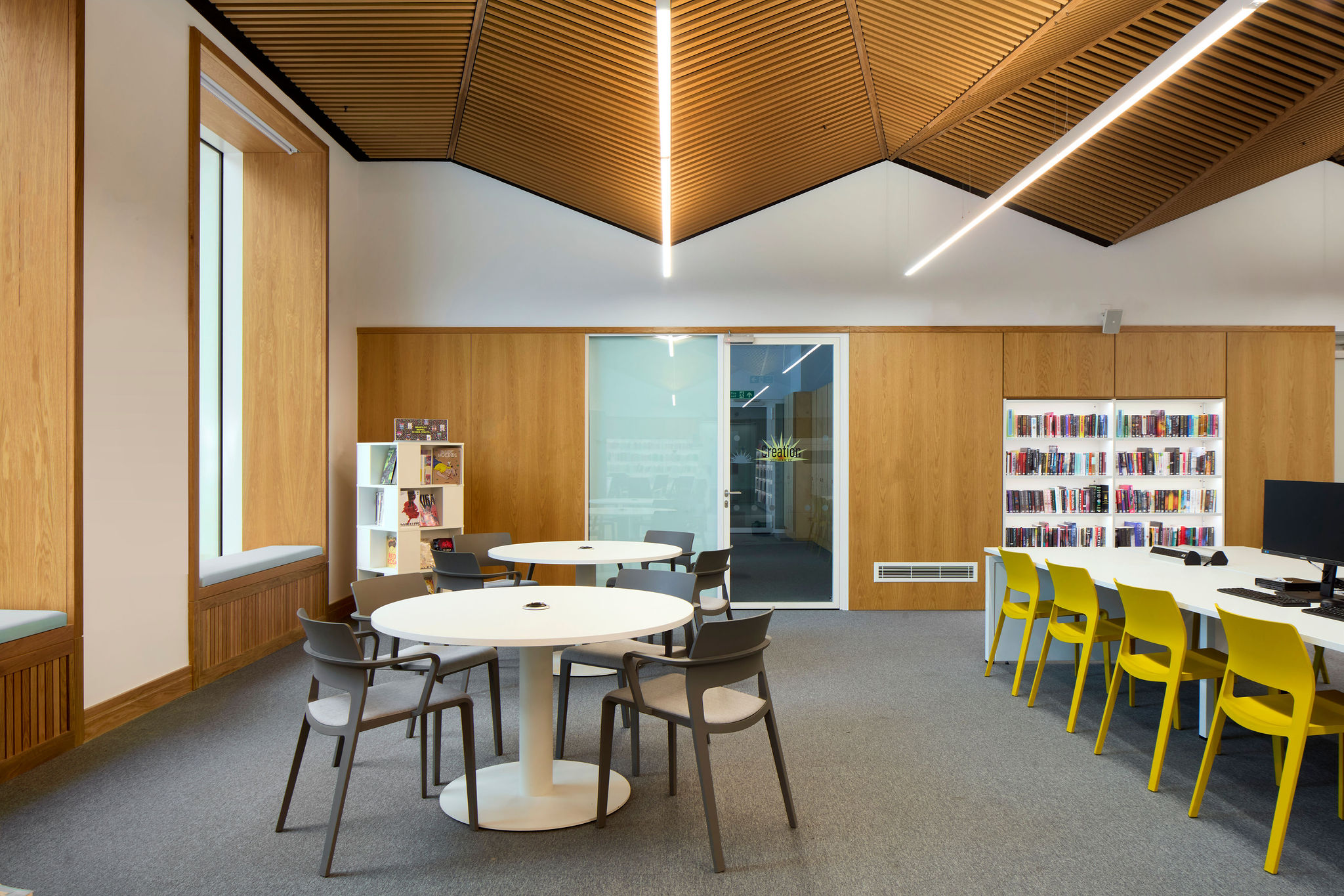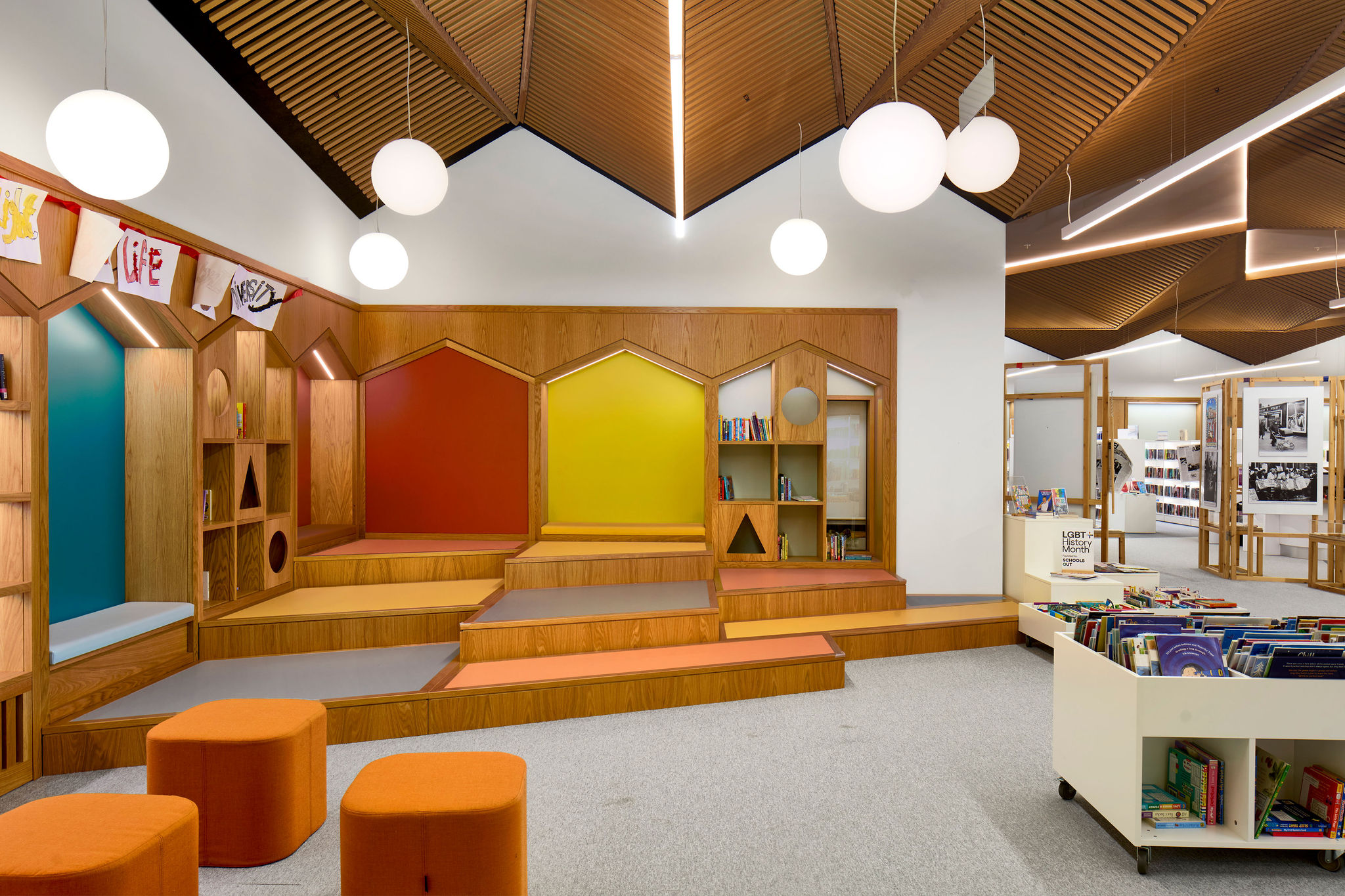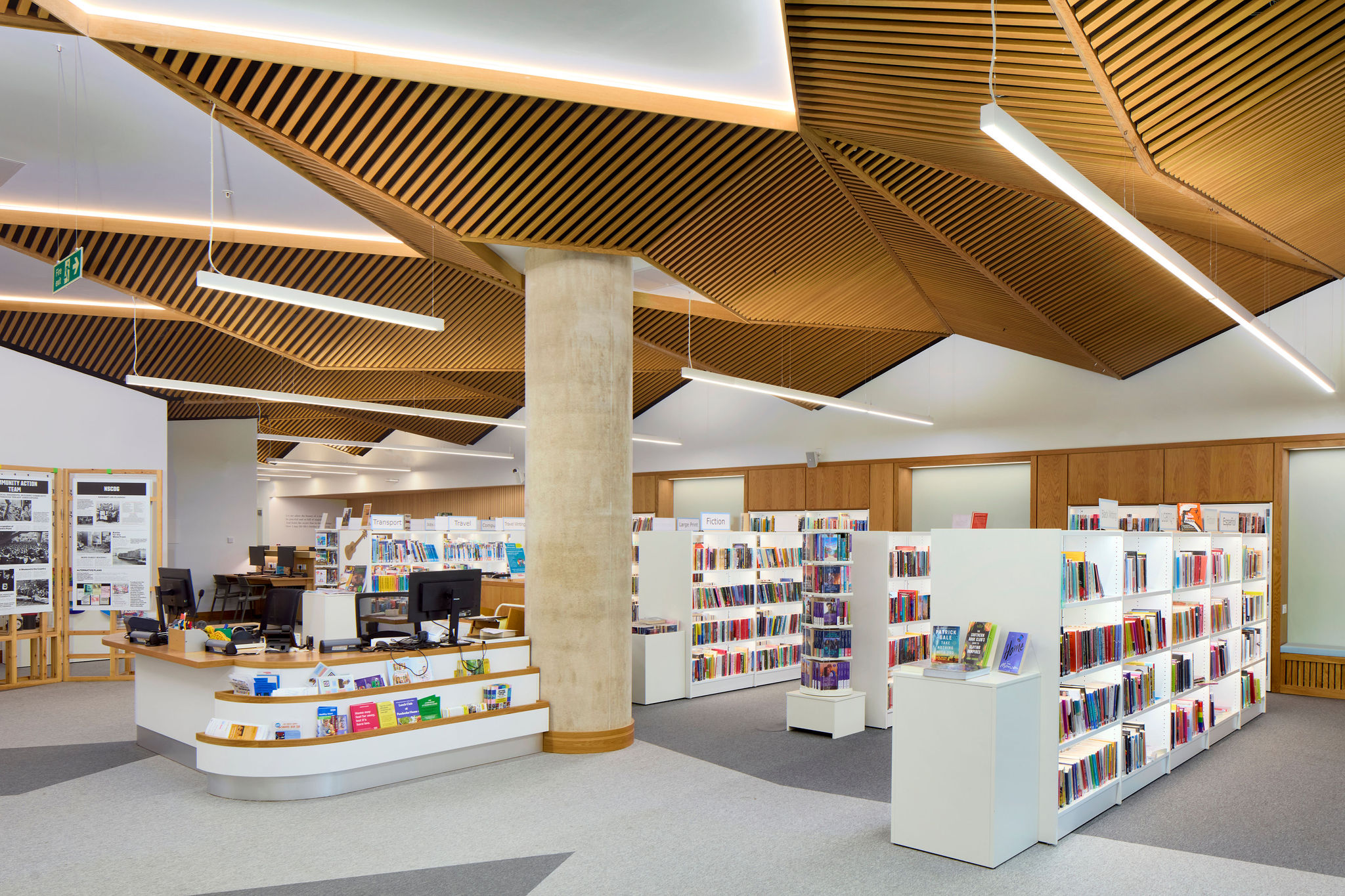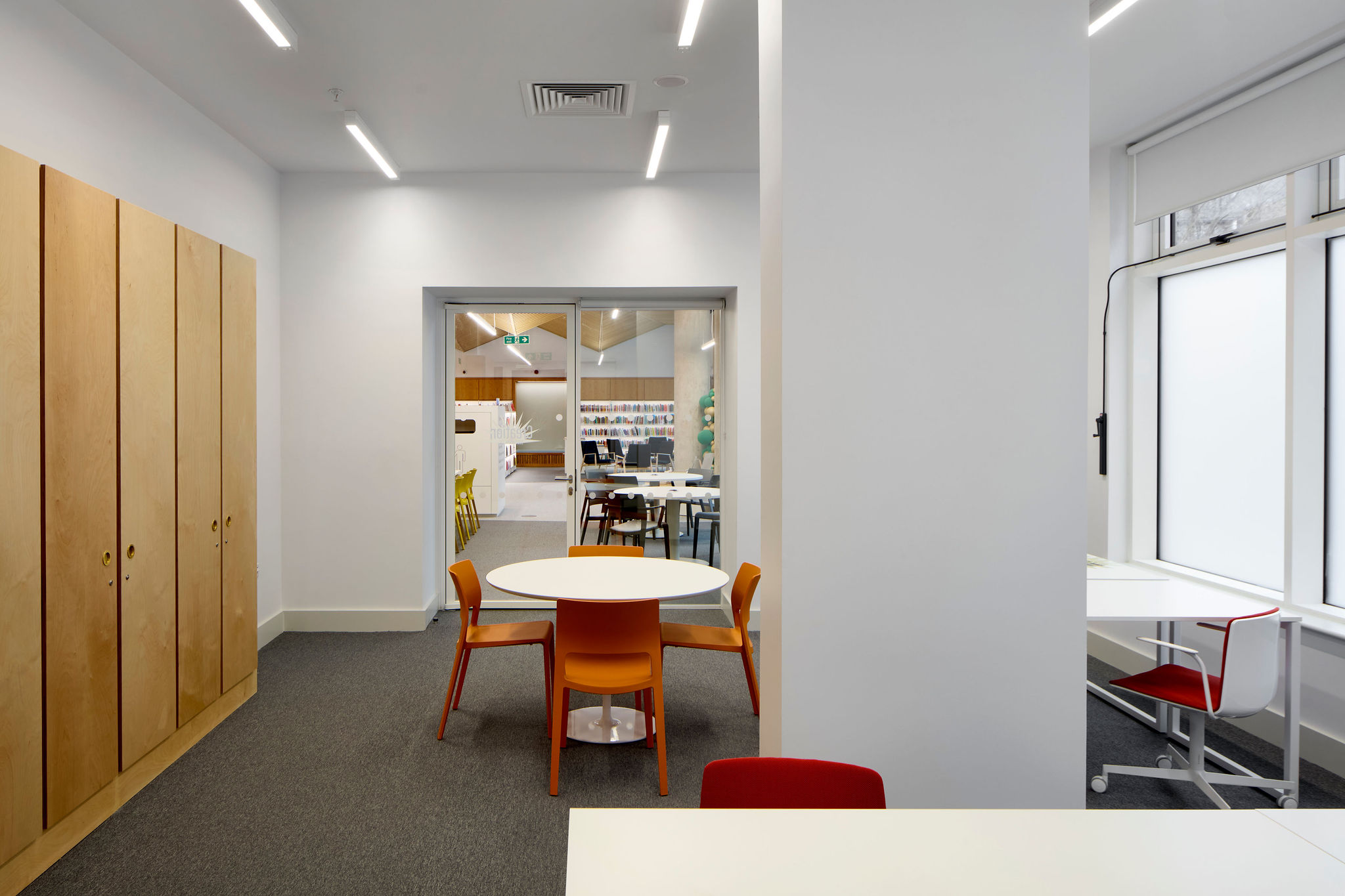 La nouvelle bibliothèque est située au rez-de-chaussée d'un immeuble résidentiel avec des logements dans les étages supérieurs. L'accès aux espaces se fait par l'entrée principale de la bibliothèque pendant les heures d'ouverture et par une porte secondaire séparée en dehors de celles-ci.