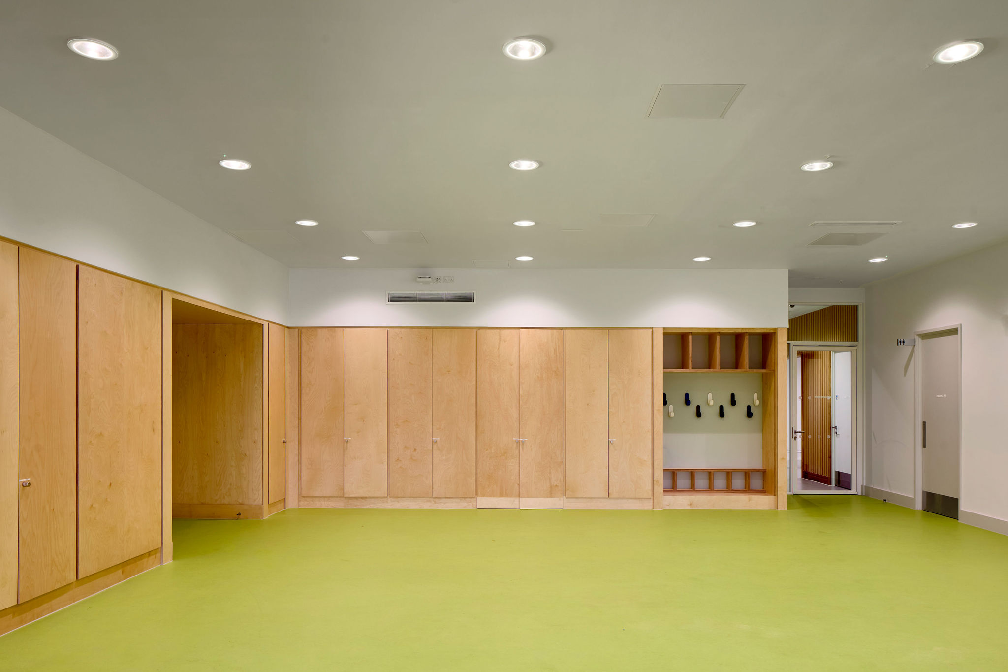 La salle polyvalente est dotée d'un revêtement de sol en bois durable et résistant à l'eau. L'ensemble des salles communes sont équipées de projecteurs et s'ouvrent directement sur la bibliothèque pour enfants au moyen de portes coulissantes.