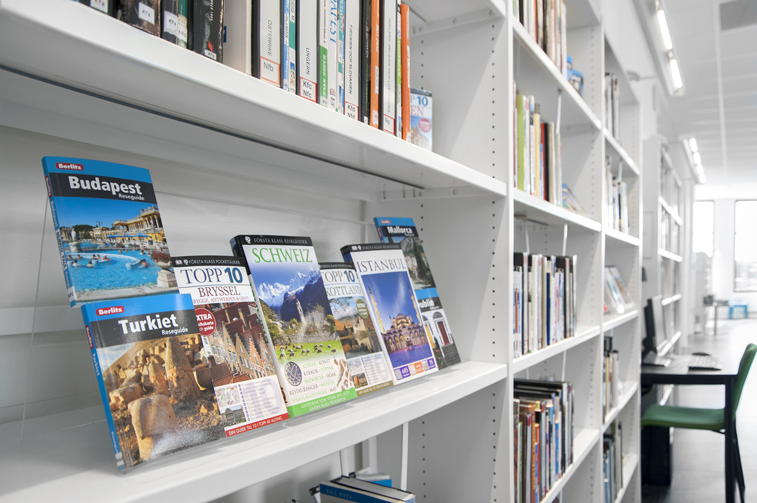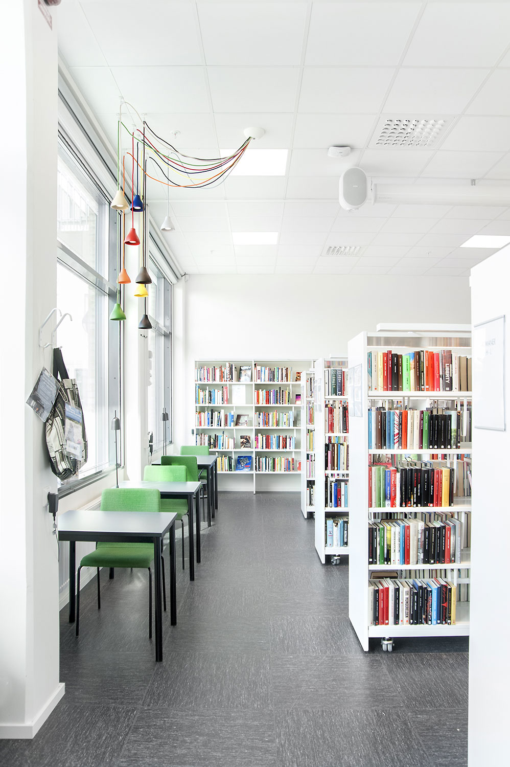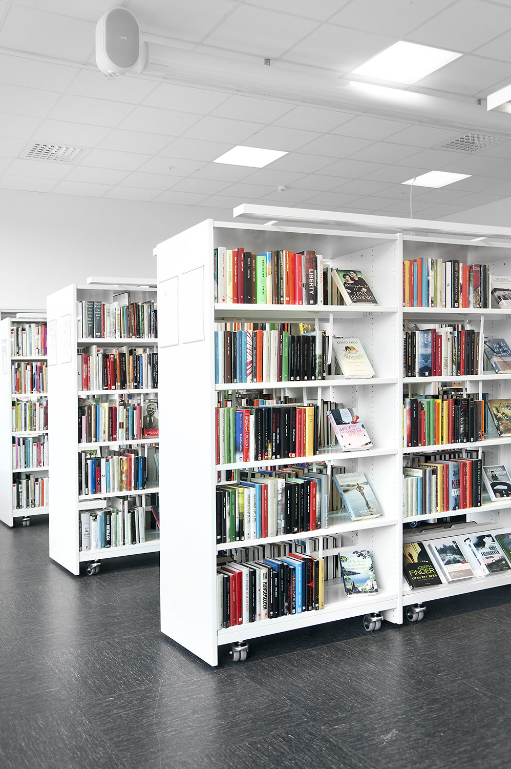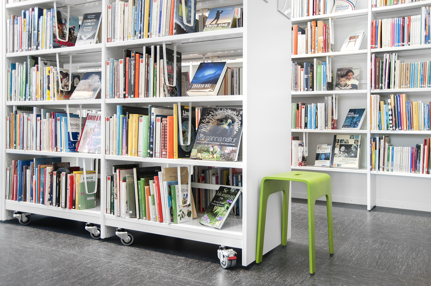 La bibliothèque est équipée d’un système de rayonnage Frontline de couleur blanche doté de diverses fonctionnalités, comme des espaces de rangement pour les périodiques ou encore des tablettes de présentation. Le système de rayonnage est aménagé de manière à être accessible depuis n’importe quel endroit de la bibliothèque.