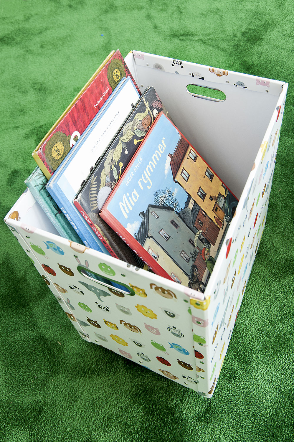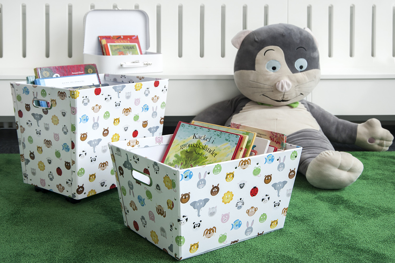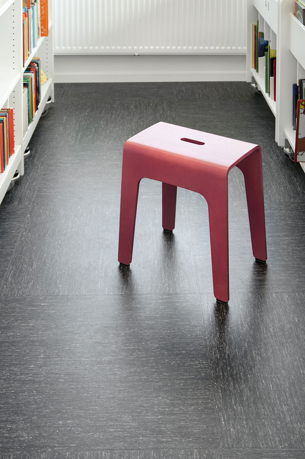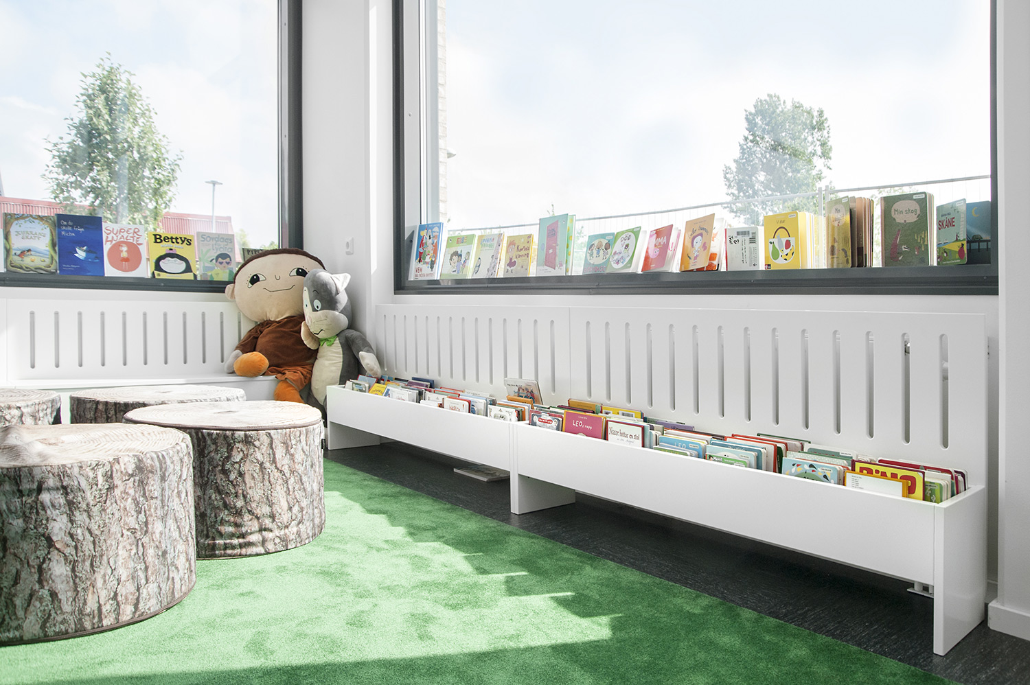 La bibliothèque est équipée d’un système de rayonnage Frontline de couleur blanche doté de diverses fonctionnalités, comme des espaces de rangement pour les périodiques ou encore des tablettes de présentation. Le système de rayonnage est aménagé de manière à être accessible depuis n’importe quel endroit de la bibliothèque.