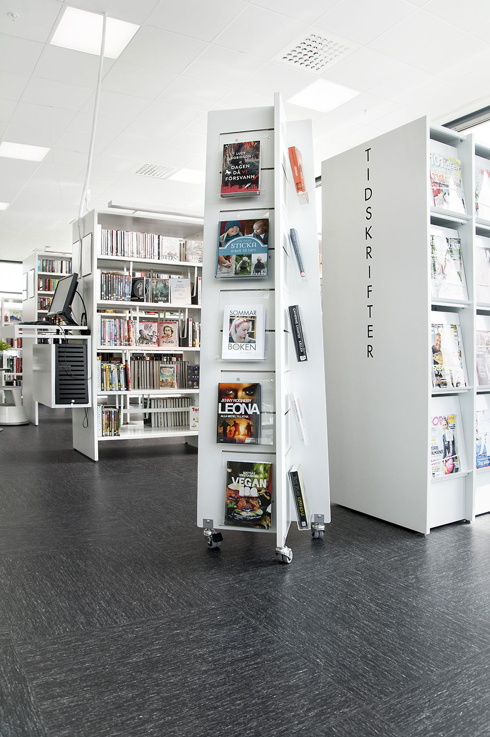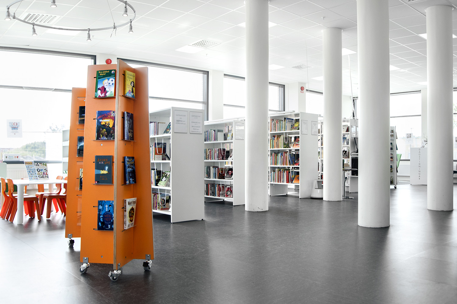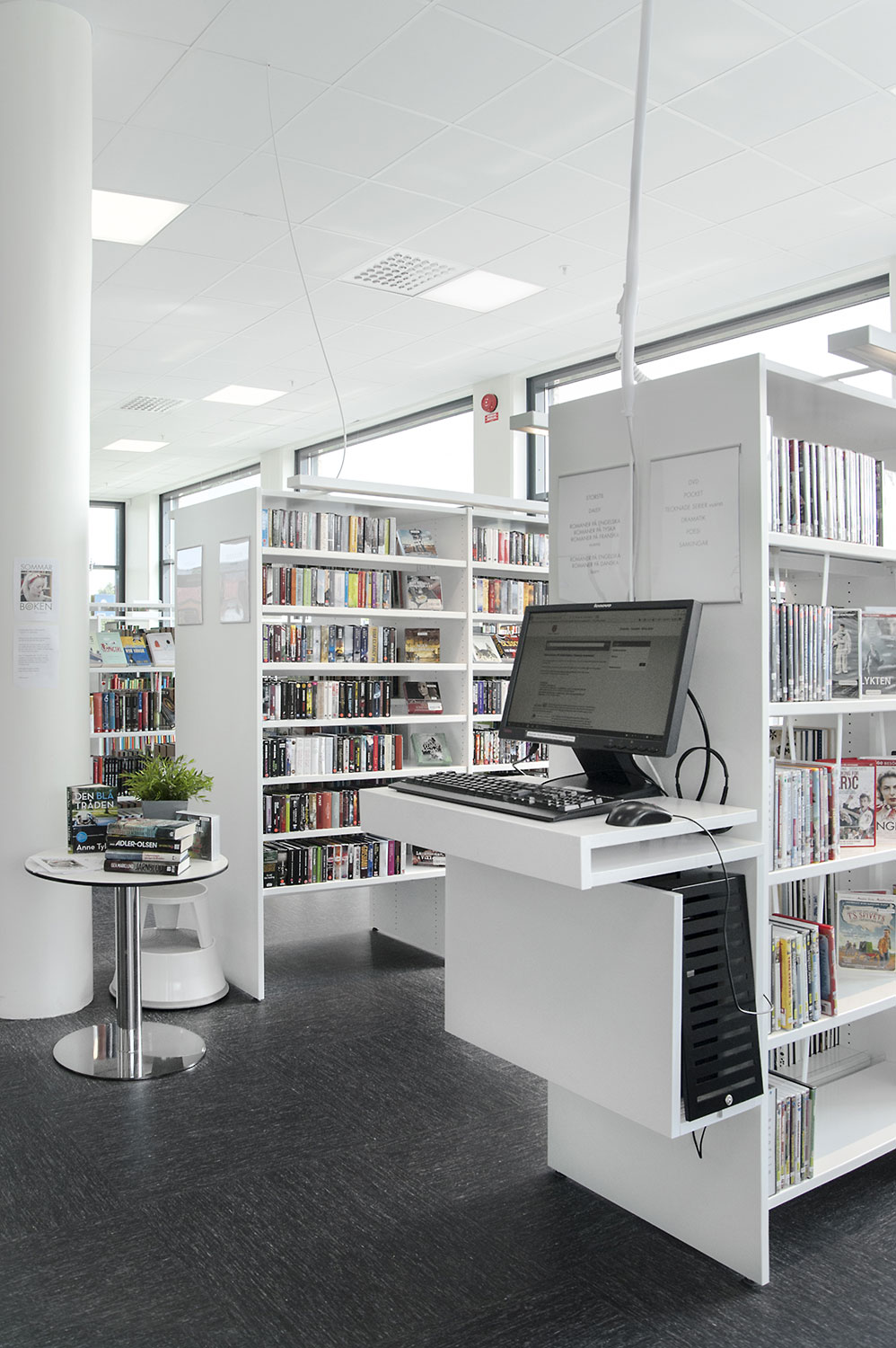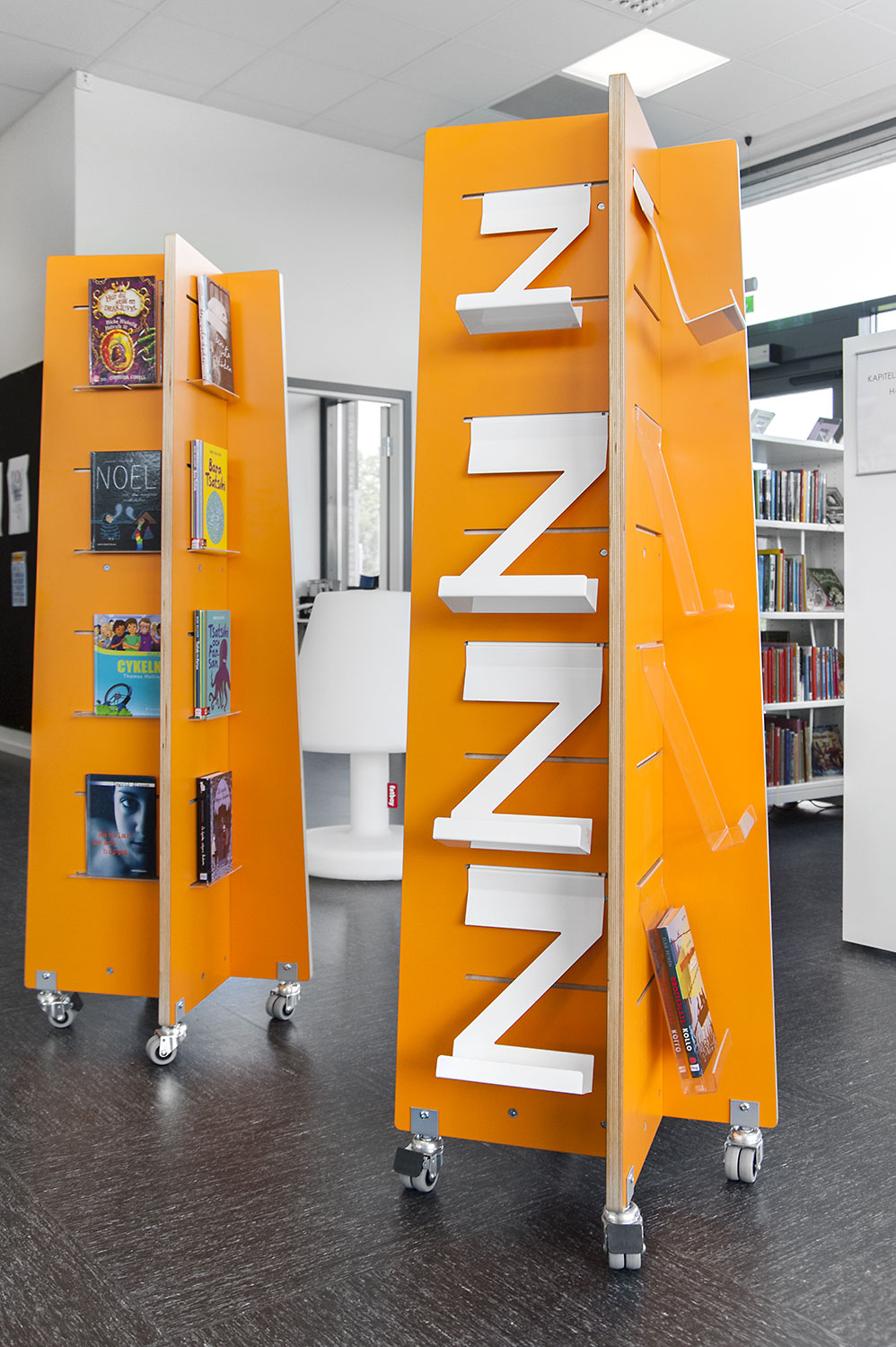 Certains rayonnages ont dû être montés sur roulettes afin d’améliorer la flexibilité et les possibilités d’utilisation des espaces de la bibliothèque pour différents événements. À certains endroits, des panneaux d’habillage accueillent des stations informatiques Eureka ou une signalétique. Pour présenter les nouveautés, certains thèmes ou susciter l’intérêt, des tours de présentation Quattro blanches et orange ont été aménagées dans deux dimensions différentes.