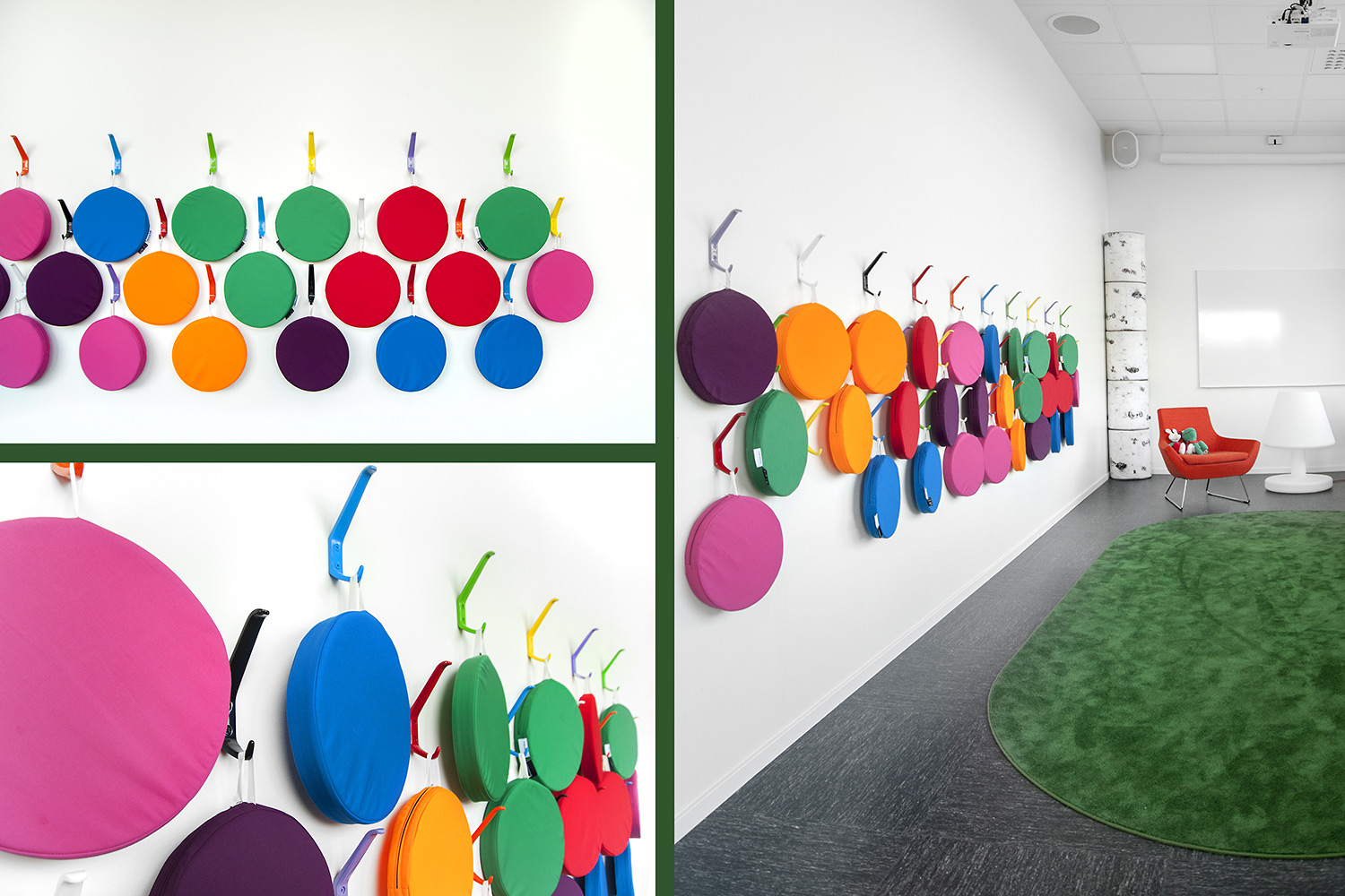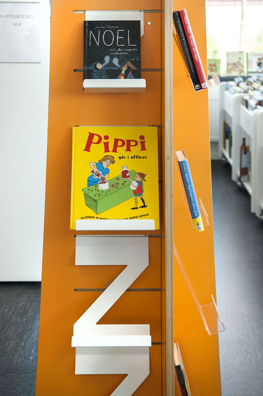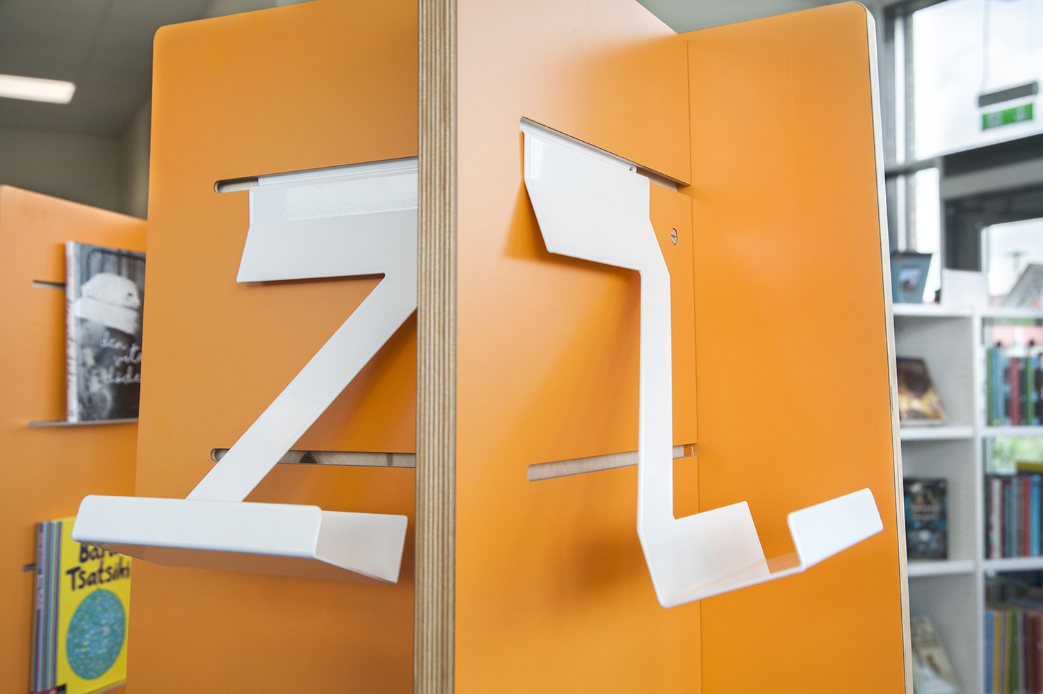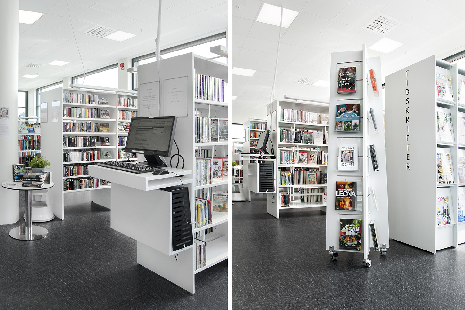 Certains rayonnages ont dû être montés sur roulettes afin d’améliorer la flexibilité et les possibilités d’utilisation des espaces de la bibliothèque pour différents événements. À certains endroits, des panneaux d’habillage accueillent des stations informatiques Eureka ou une signalétique. Pour présenter les nouveautés, certains thèmes ou susciter l’intérêt, des tours de présentation Quattro blanches et orange ont été aménagées dans deux dimensions différentes.