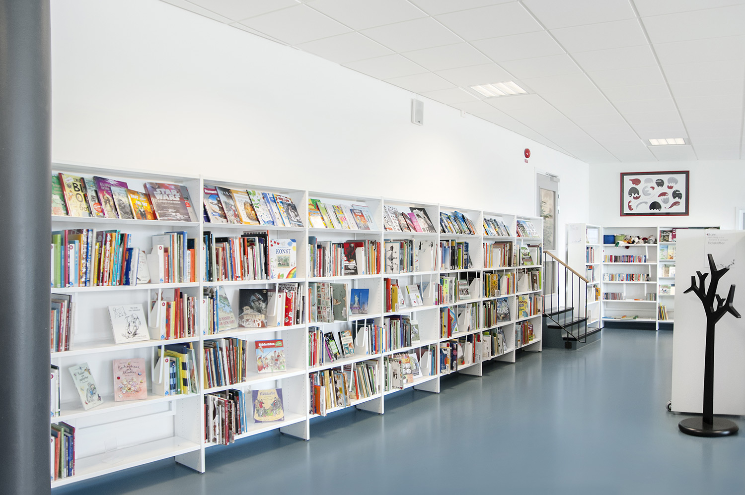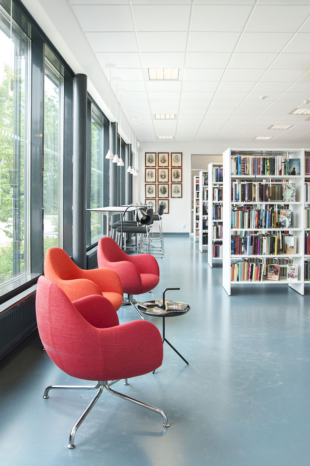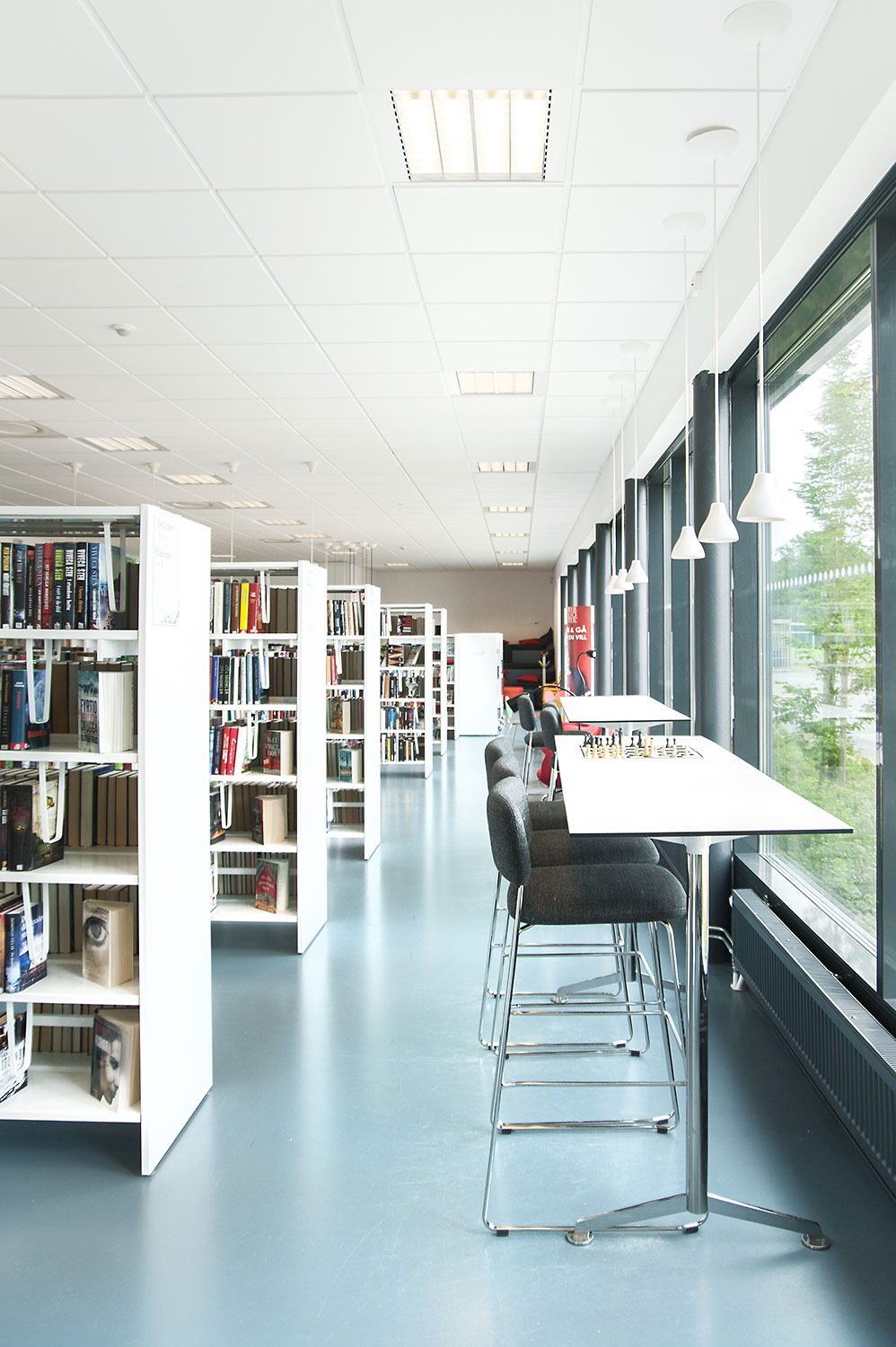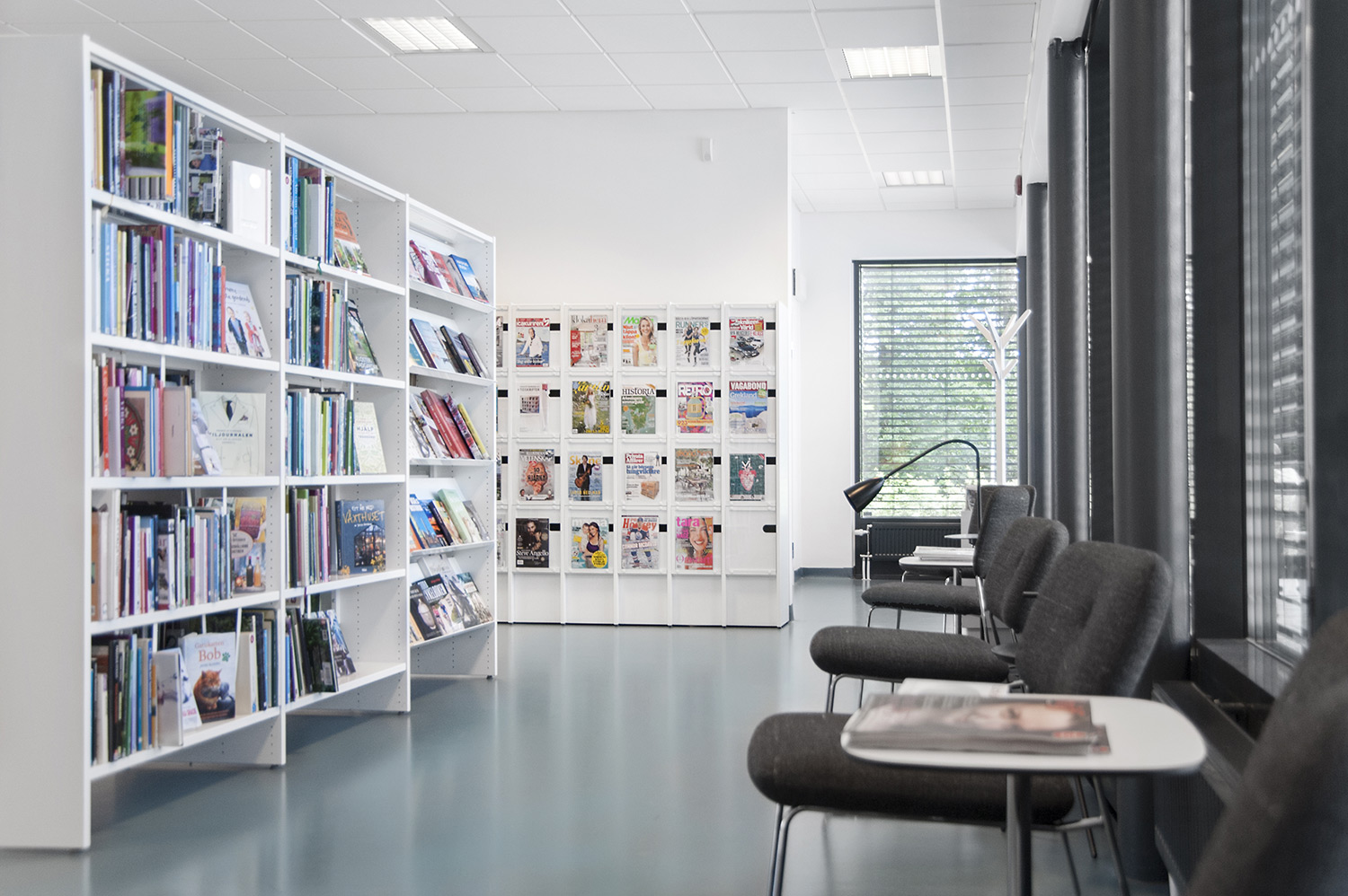 Le système de rayonnages Frontline est présent dans toute la bibliothèque. Les périodiques sont exposés et rangés dans l’armoire de présentation Ordrup et la banque d’accueil Concertina est le point d’information central de la bibliothèque.