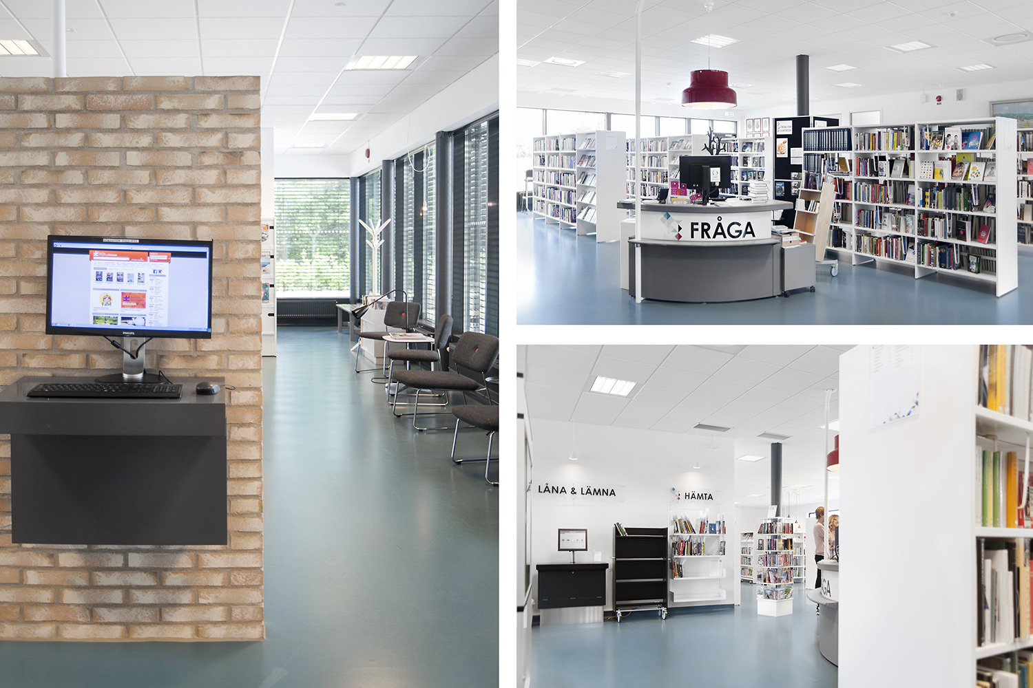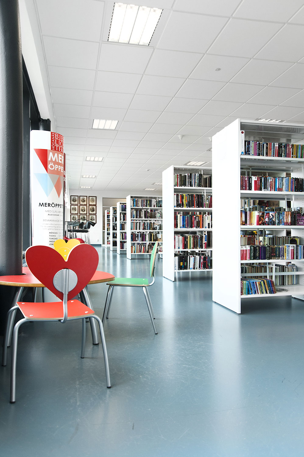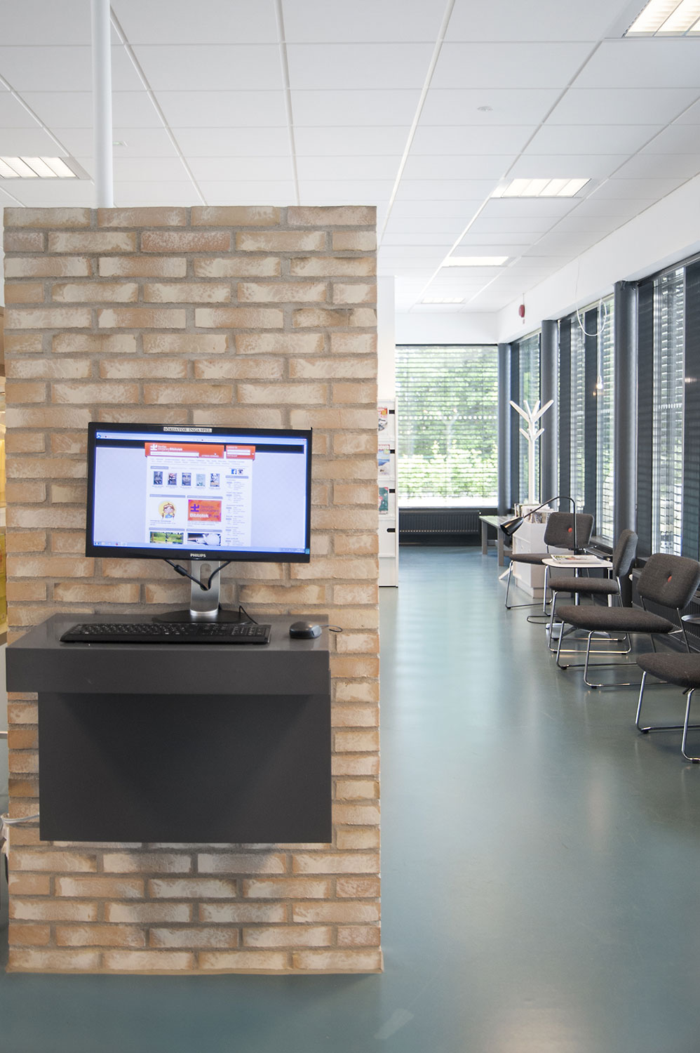 Le système de rayonnages Frontline est présent dans toute la bibliothèque. Les périodiques sont exposés et rangés dans l’armoire de présentation Ordrup et la banque d’accueil Concertina est le point d’information central de la bibliothèque.