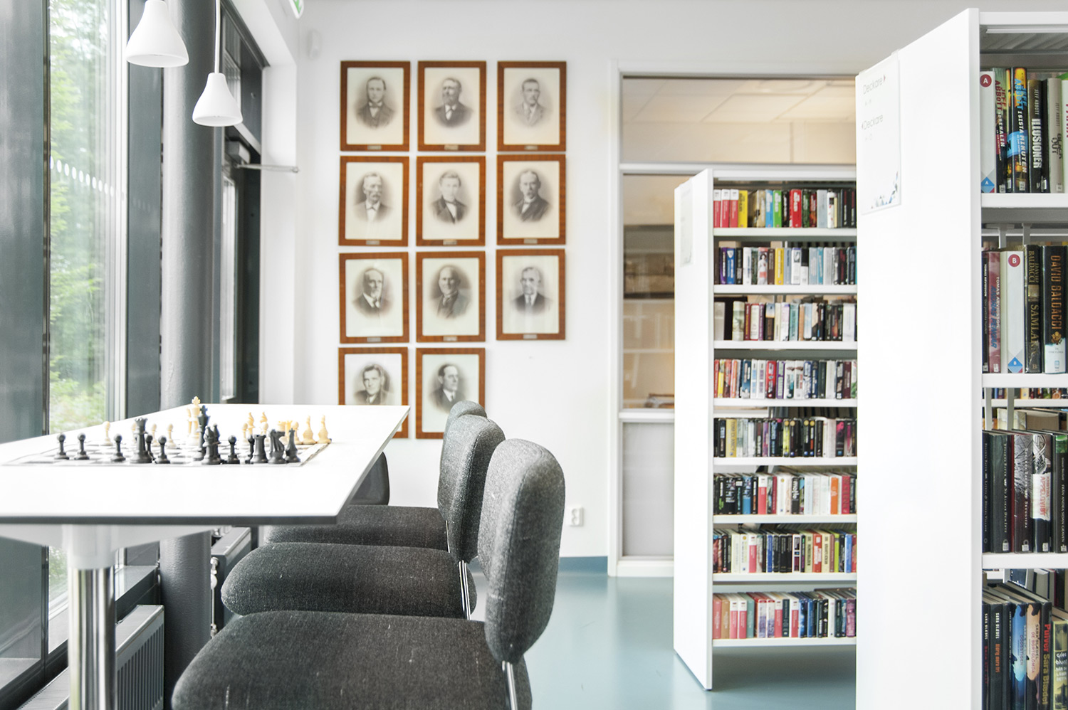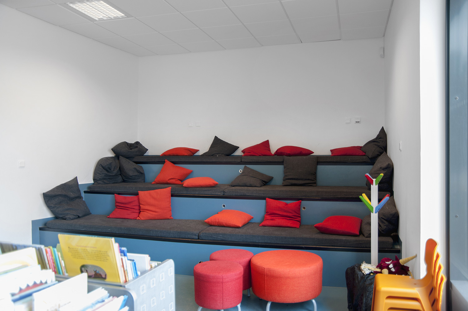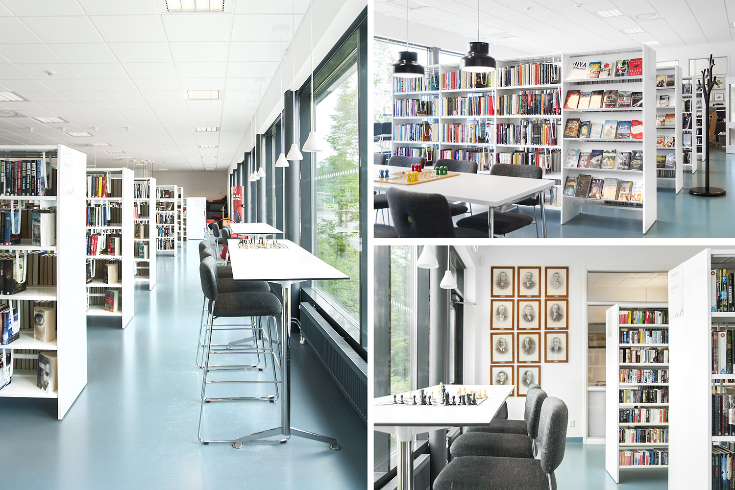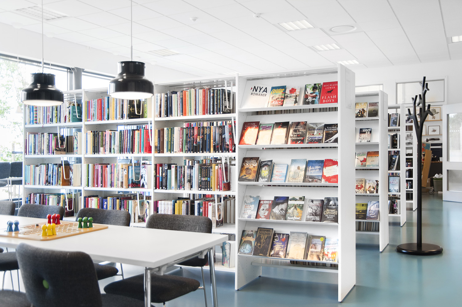 Le système de rayonnages Frontline est présent dans toute la bibliothèque. Les périodiques sont exposés et rangés dans l’armoire de présentation Ordrup et la banque d’accueil Concertina est le point d’information central de la bibliothèque.
