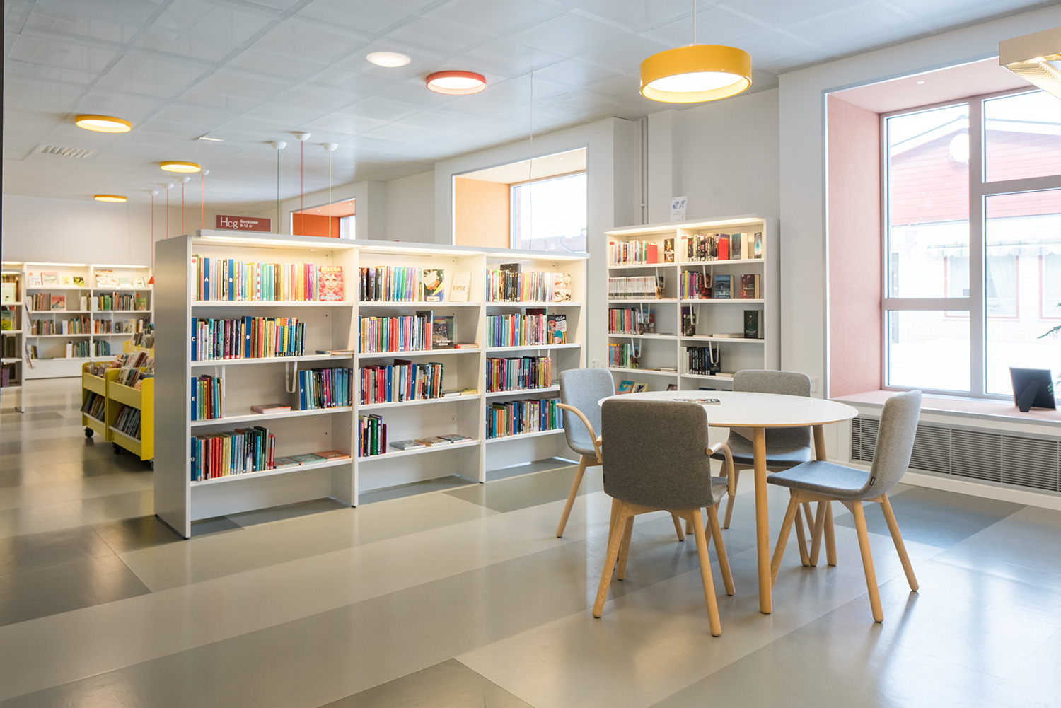 La bibliothèque a été conçue dans un cadre qui tire avantage de la lumière naturelle pénétrant par de larges fenêtres. Le résultat est un environnement lumineux et accueillant. Toutes les catégories d’âges ont été prises en considération, puisqu’on y trouve une attrayante section pour enfants et plusieurs zones de lecture et d’étude permettant d’accéder facilement aux ouvrages de la bibliothèque archivés sur des rayonnages éclairés.
