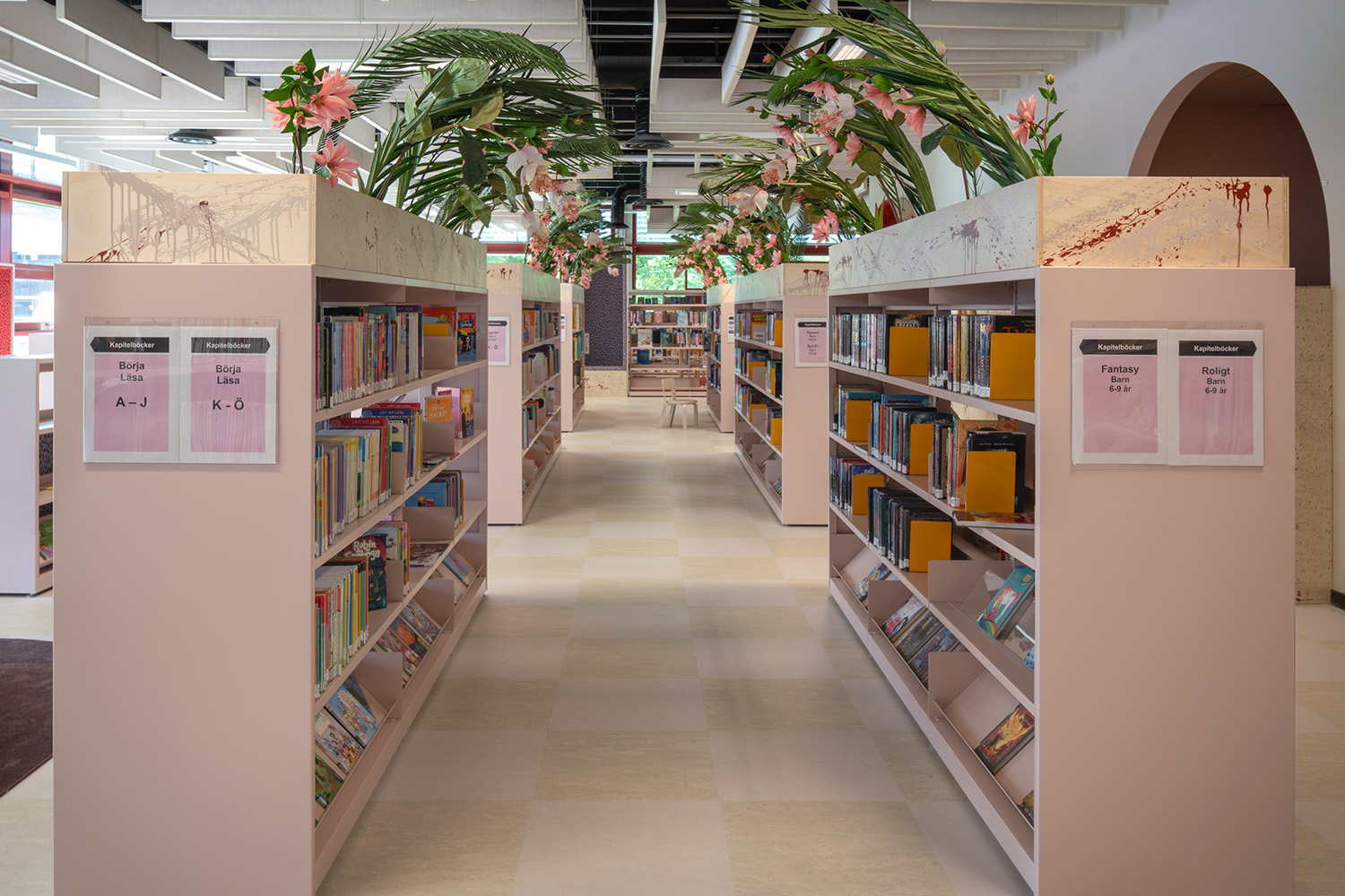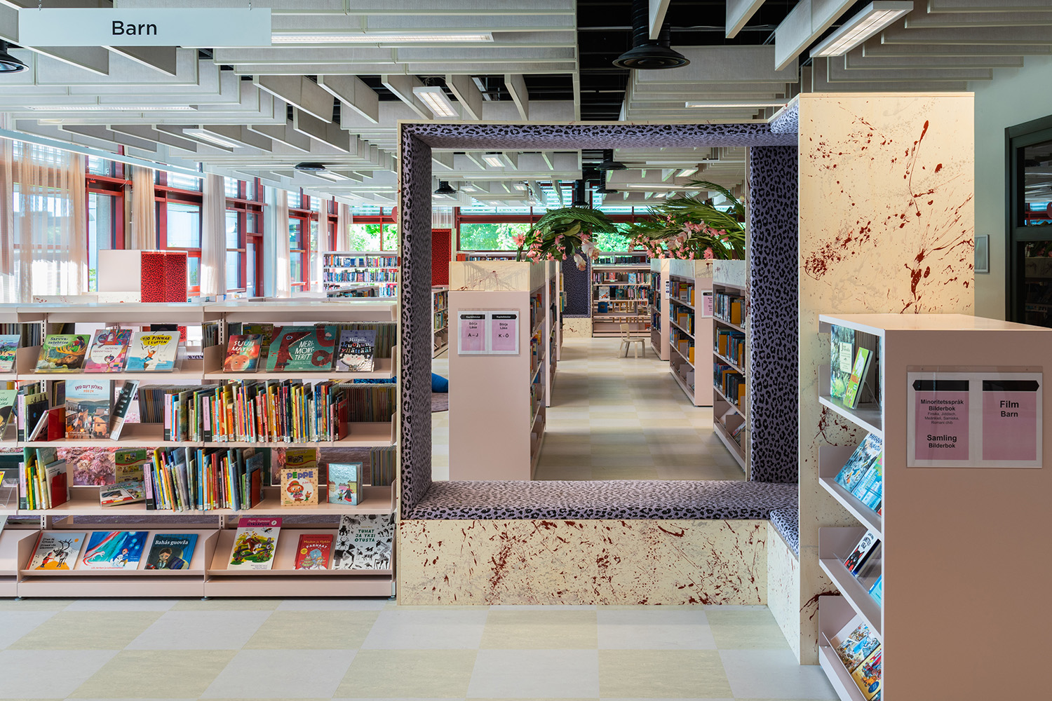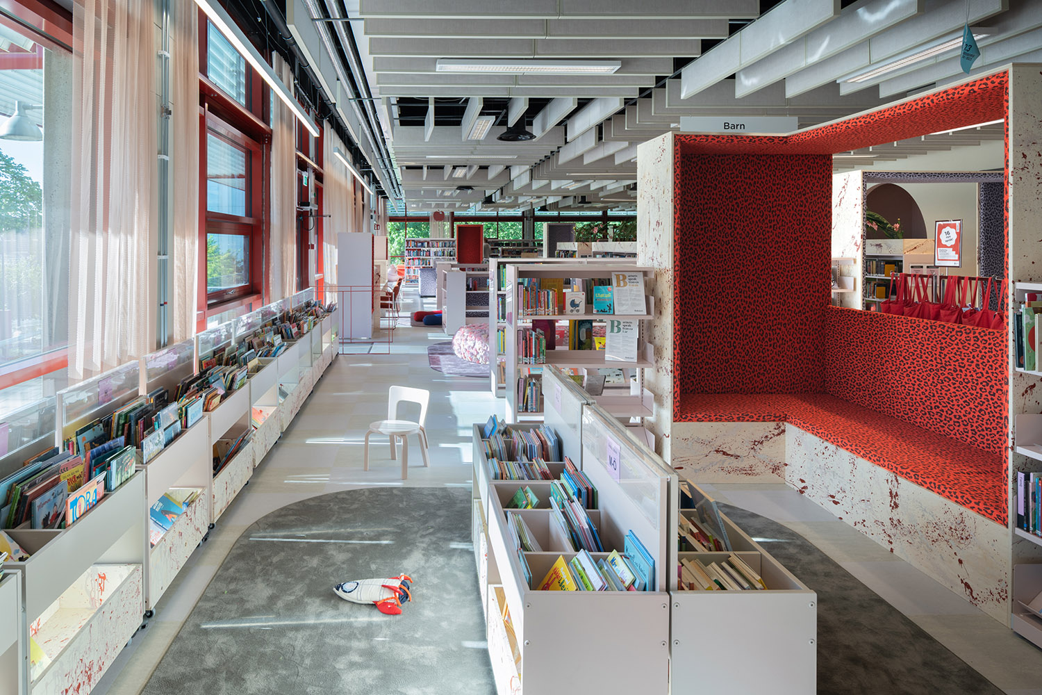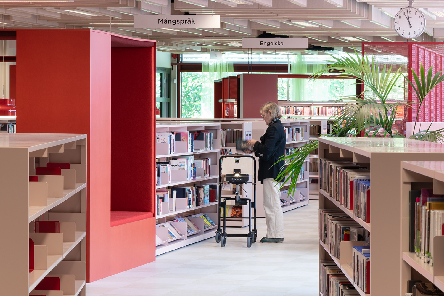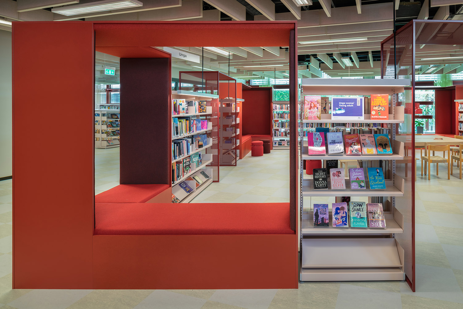 La bibliothèque occupe une place essentielle dans le Centre Culturel de Frölunda. Ses rayonnages modulables permettent de proposer une grande variété de supports tels que des livres, des magasines et des resources multimédias. Conçue comme un espace d’apprentissage inclusif, elle offre différents environnements : zones calmes pour l’étude, espaces collaboratifs et aires spécialement pensées pour les enfants.