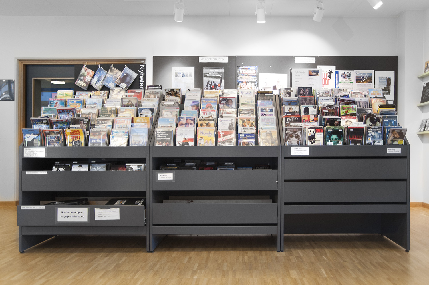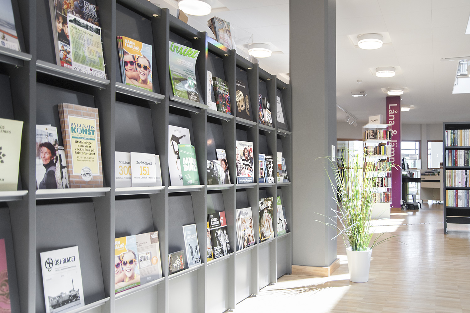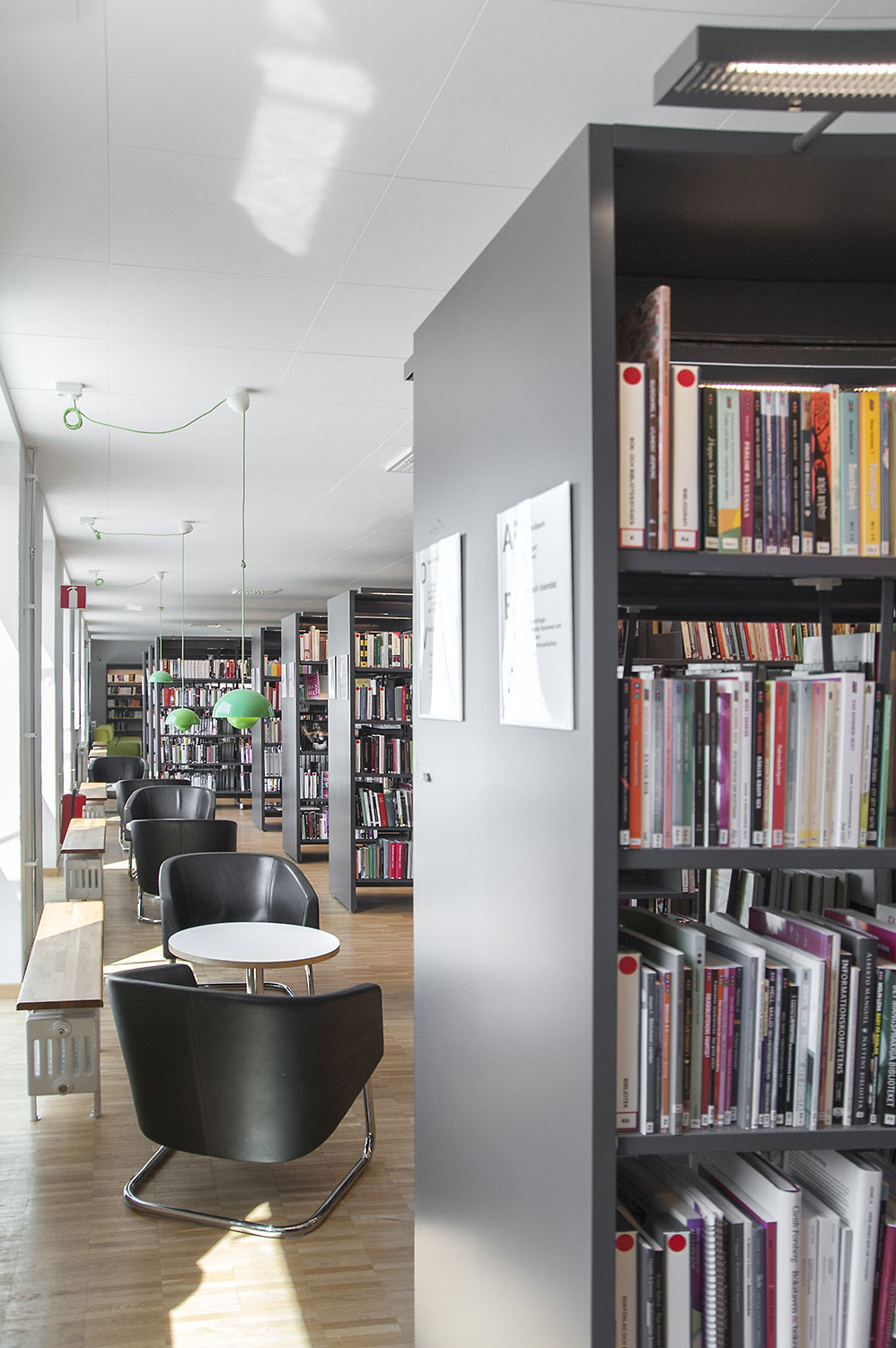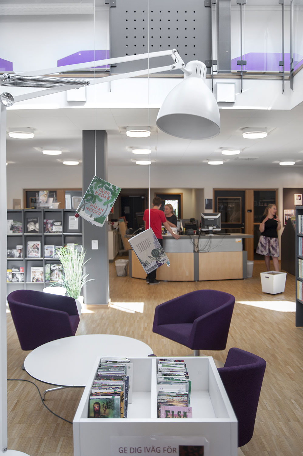 Cette bibliothèque est à la fois une bibliothèque publique et une bibliothèque scolaire intégrée à la Sunds High School de la municipalité de Vellinge. Son caractère spacieux et l’opportunité de pouvoir à la fois y étudier et se détendre en font un excellent environnement de travail pour les étudiants et les citoyens.