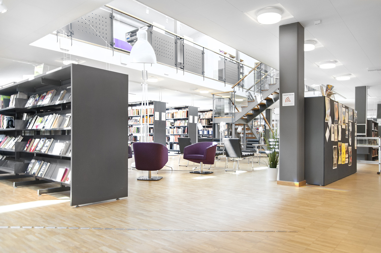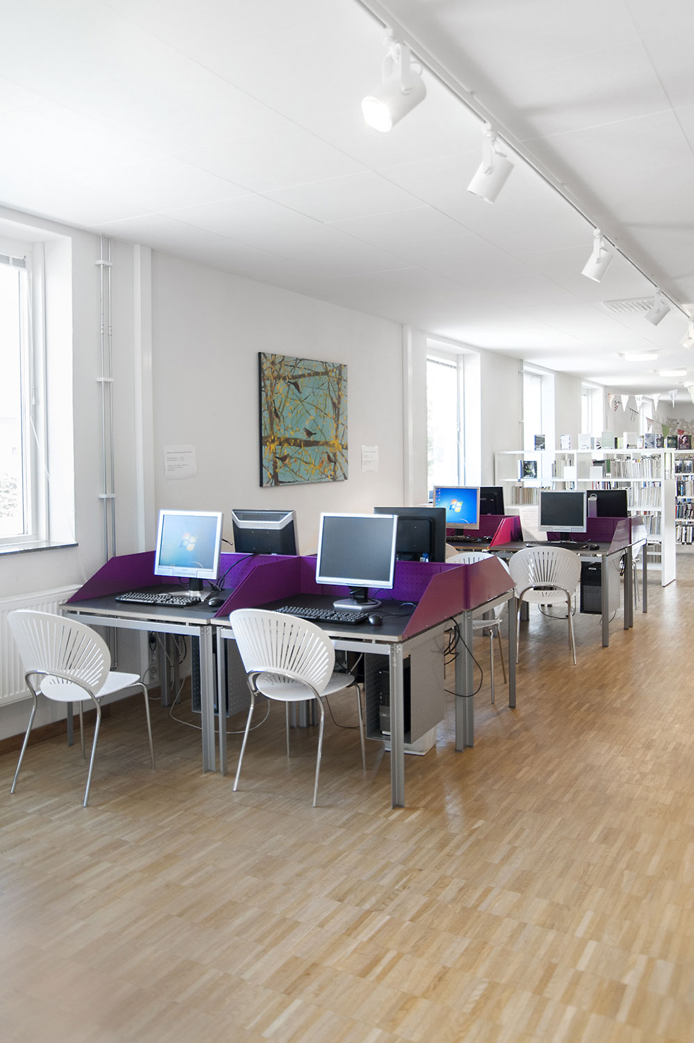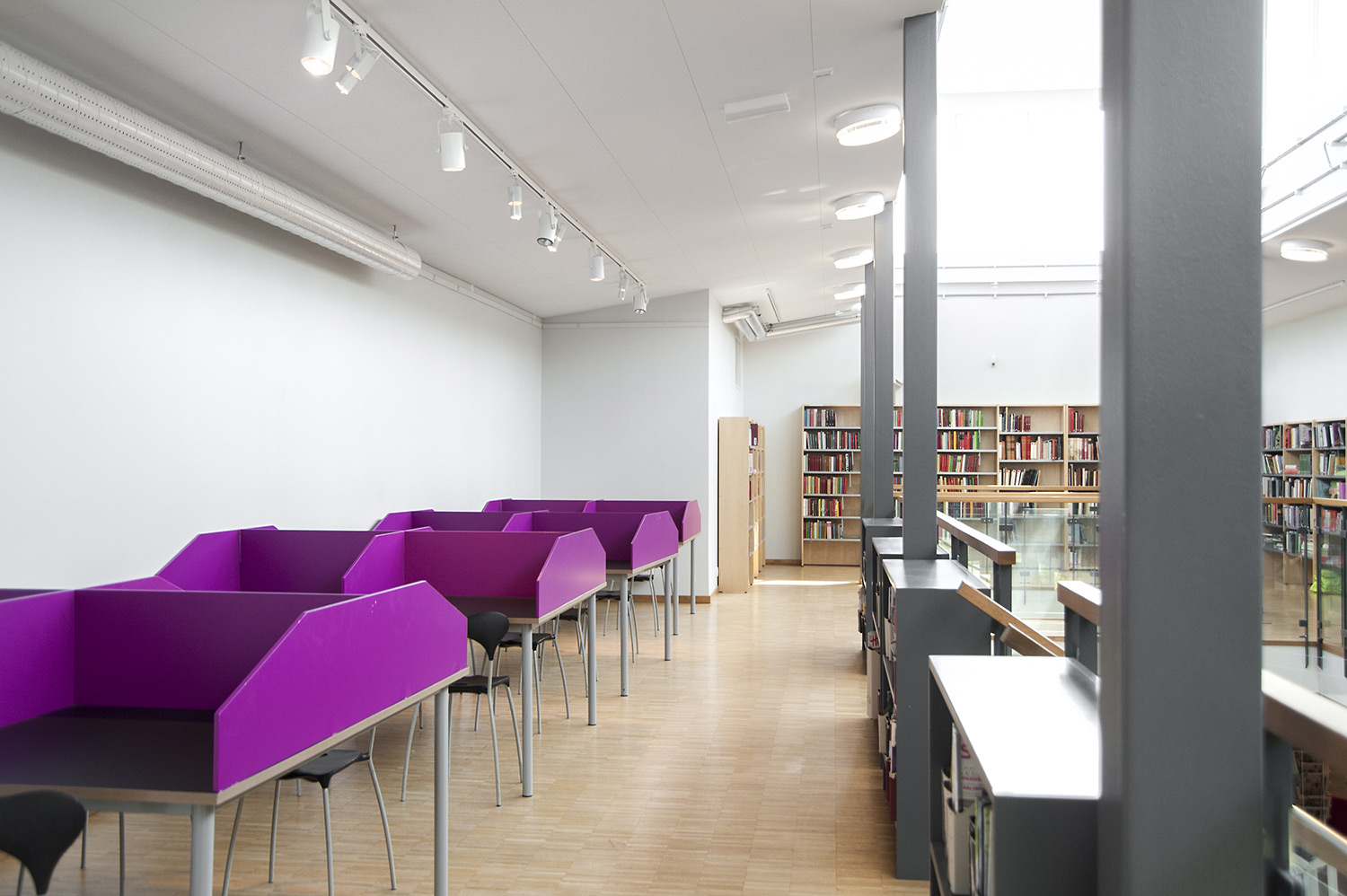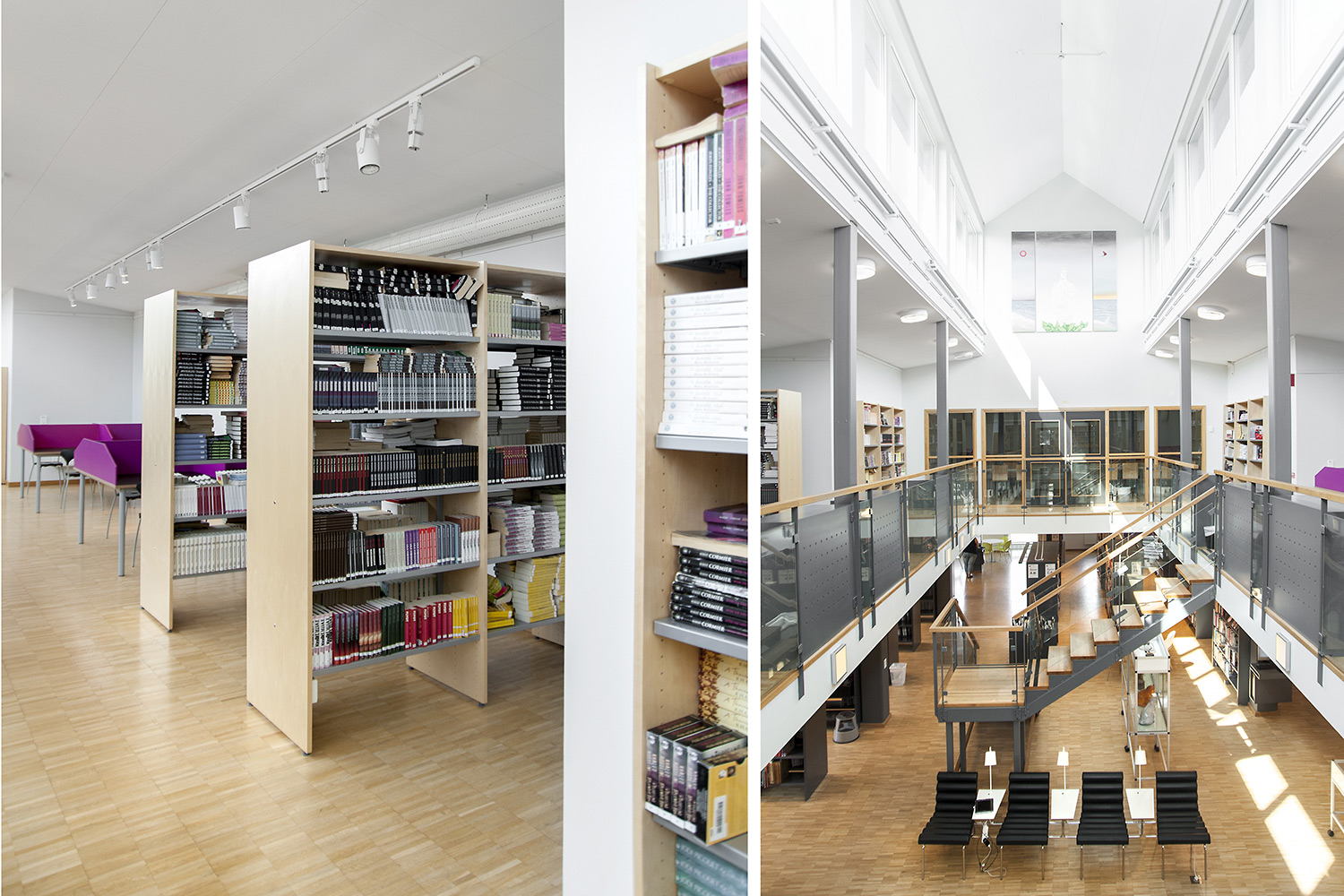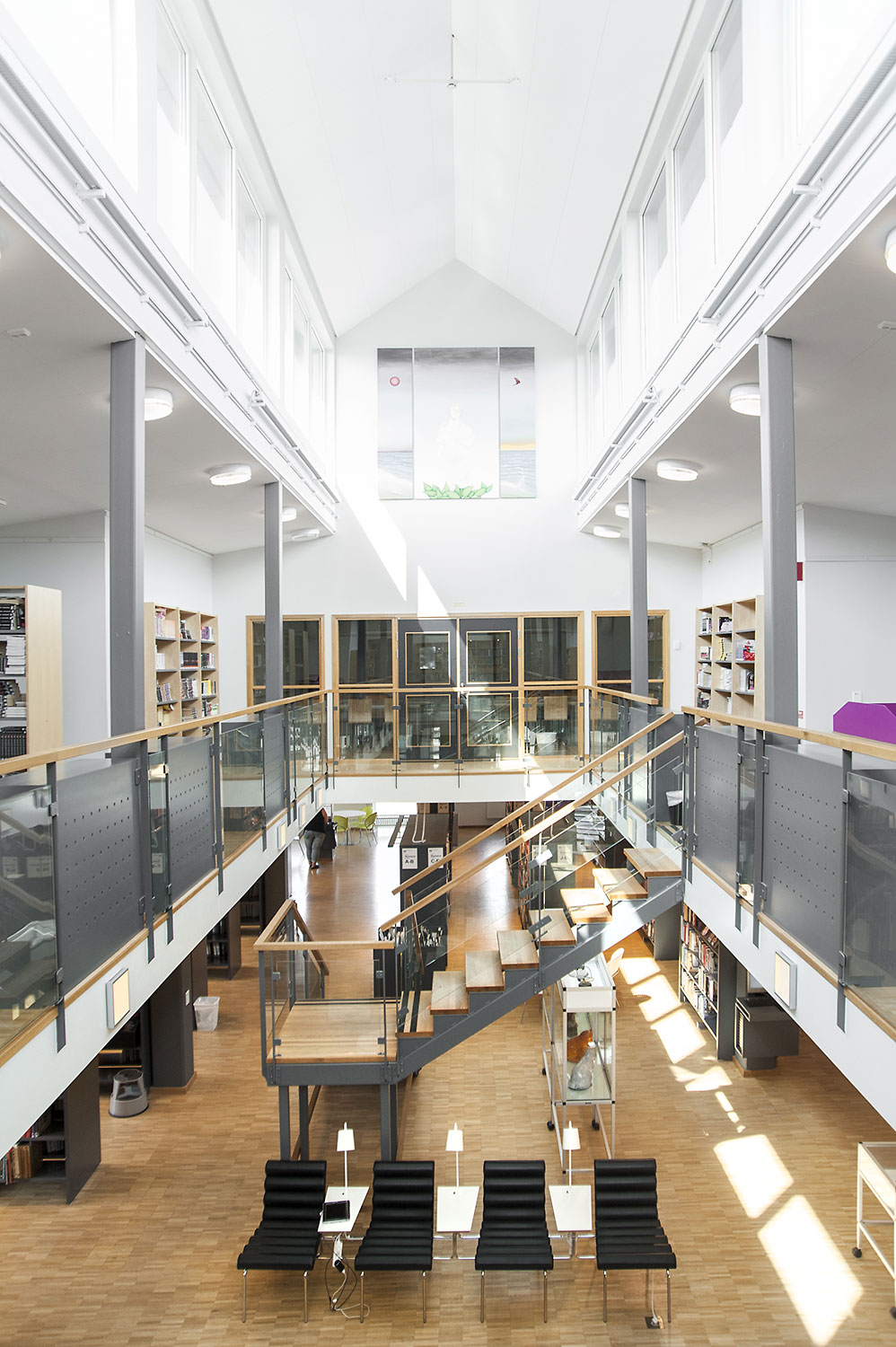 Cette bibliothèque est à la fois une bibliothèque publique et une bibliothèque scolaire intégrée à la Sunds High School de la municipalité de Vellinge. Son caractère spacieux et l’opportunité de pouvoir à la fois y étudier et se détendre en font un excellent environnement de travail pour les étudiants et les citoyens.