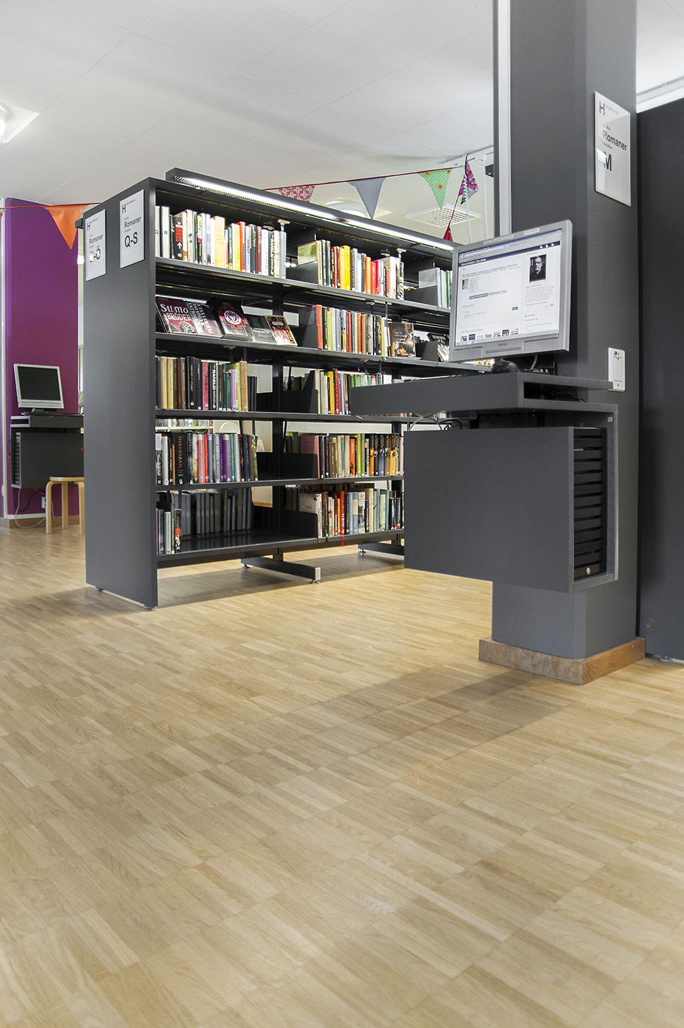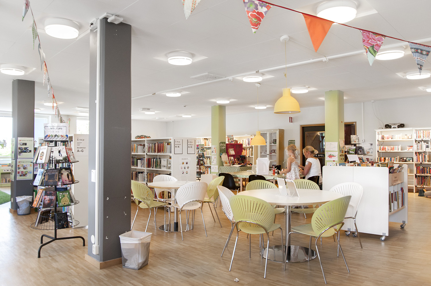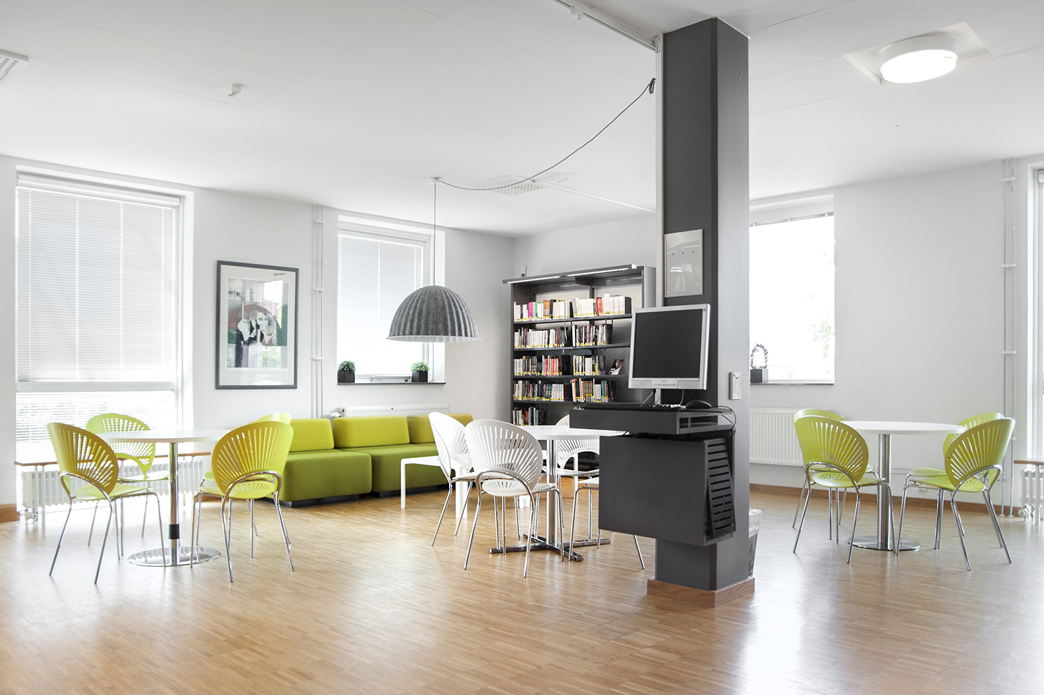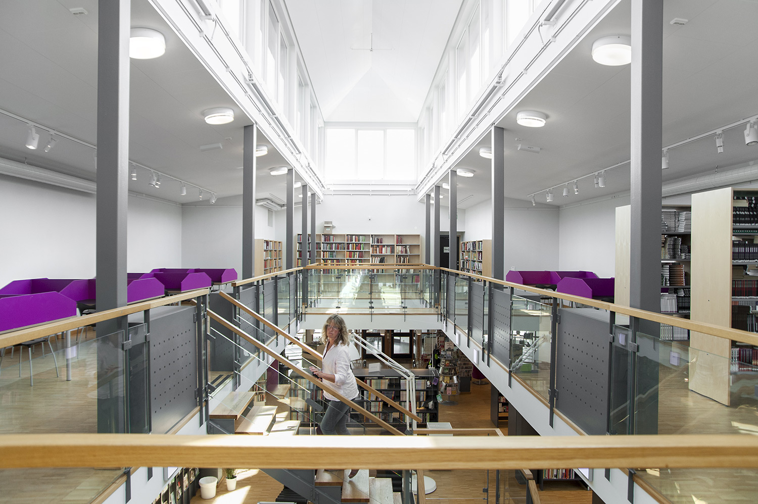 Cette bibliothèque est à la fois une bibliothèque publique et une bibliothèque scolaire intégrée à la Sunds High School de la municipalité de Vellinge. Son caractère spacieux et l’opportunité de pouvoir à la fois y étudier et se détendre en font un excellent environnement de travail pour les étudiants et les citoyens.