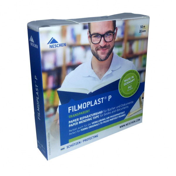 Papier spécial stable, robuste, doux et ultra-transparent. Revêtement résistant au vieillissement et au jaunissement, adhésif acrylique élastique, tamponné avec du CACO3, légèrement alcalin afin d’empêcher toute détérioration des documents, mais avec un pouvoir tampon suffisant pour prévenir la destruction par l’acidité.