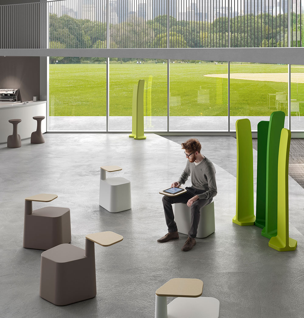 Ce meuble combiné proposant une assise et un support pour ordinateur portable a été conçu pour les réunions brèves ou les pauses (dans une cafétéria, une pièce de travail ou au sein de la bibliothèque).